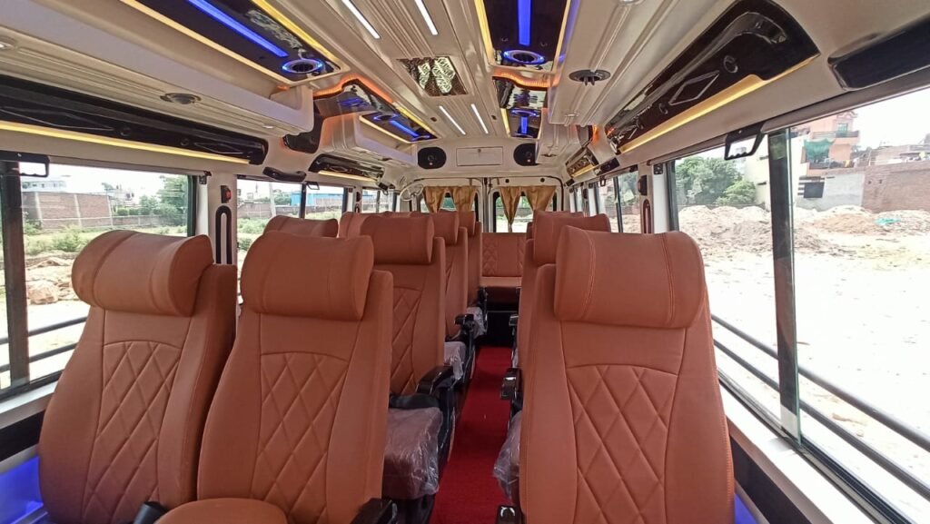 17 Seater Tempo Traveller in Patna: Ideal for medium-sized groups, featuring reclining seats, powerful AC, and ample legroom.