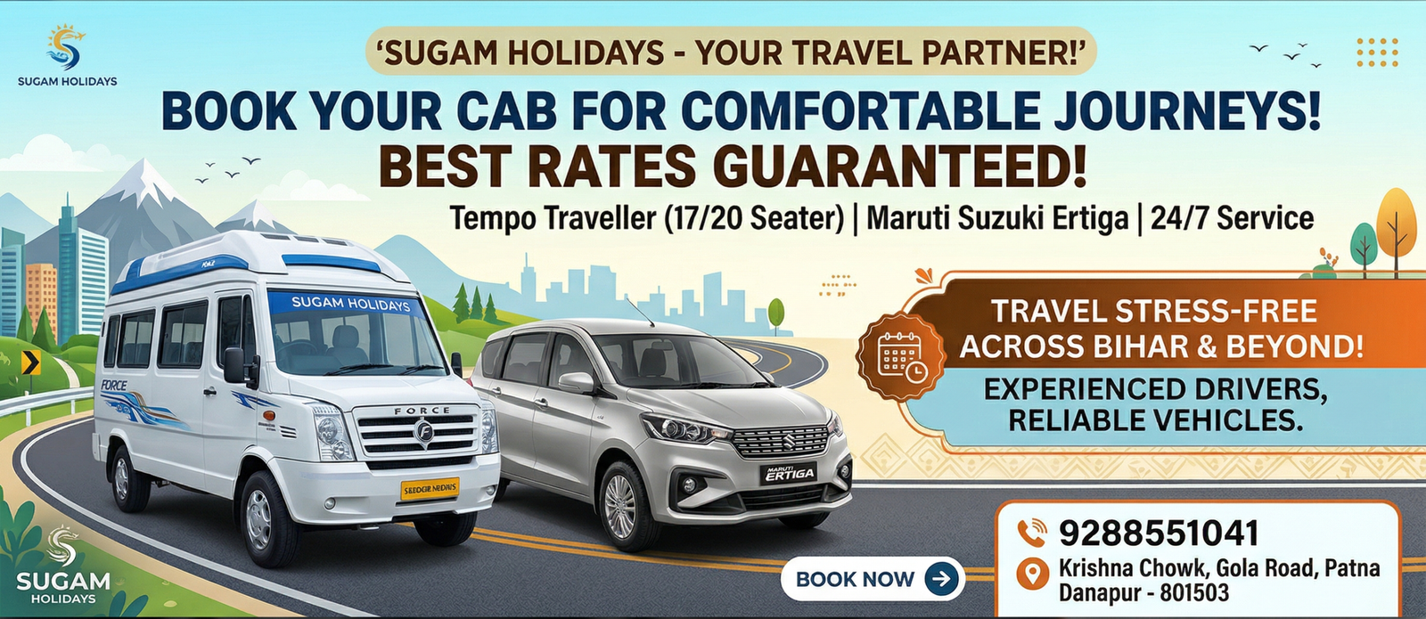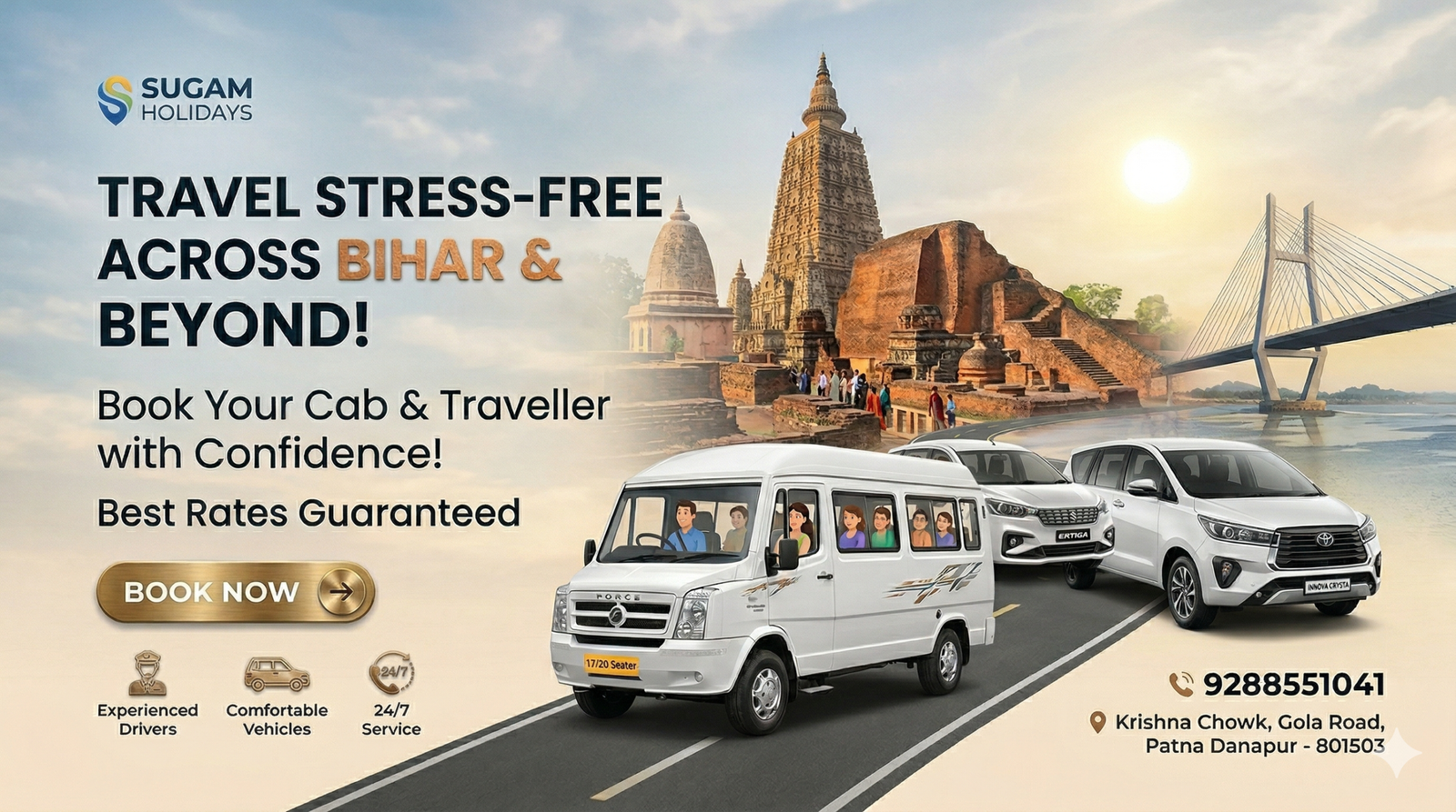 Welcome to Sugam Holidays, the leading provider of premium transport solutions in Patna and Danapur. Established with a vision to make group travel “Sugam” (Easy) and comfortable, we specialize in high-quality Tempo Traveller rentals and cab services tailored for every journey. Get the best rates on 17/20 seater Force Travellers. Perfect for outstation trips, weddings, and airport transfers. Professional drivers and 24/7 support. Located at Krishna Chowk, Gola Road. Call to Action: Call 9288551041 to reserve your dates!